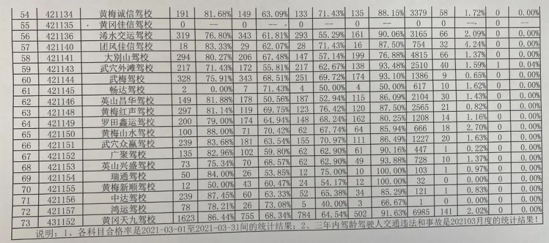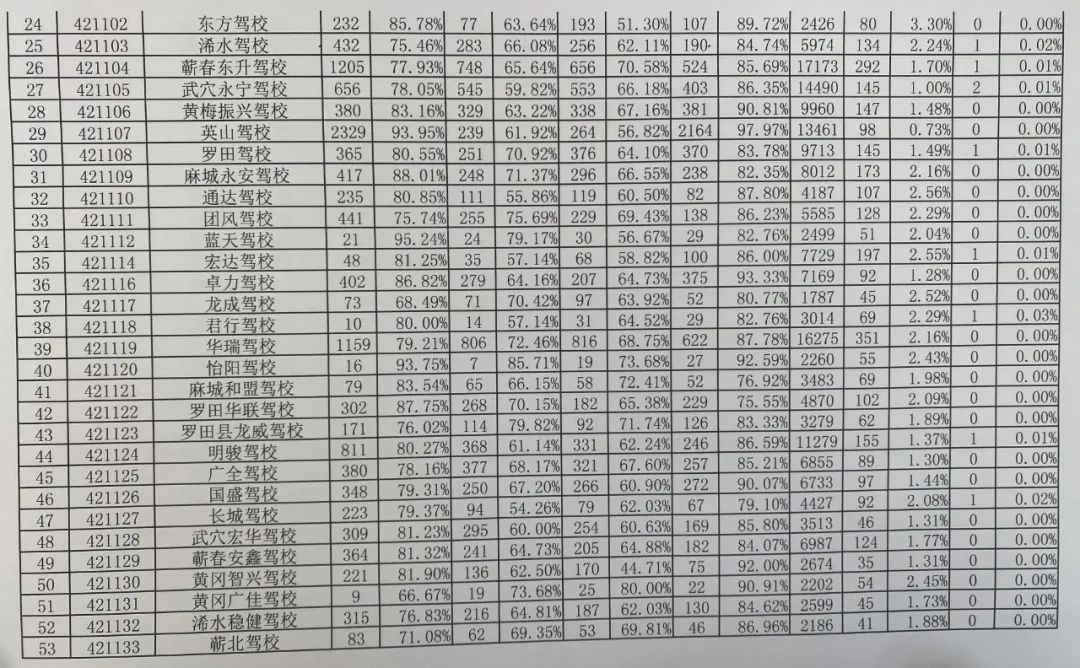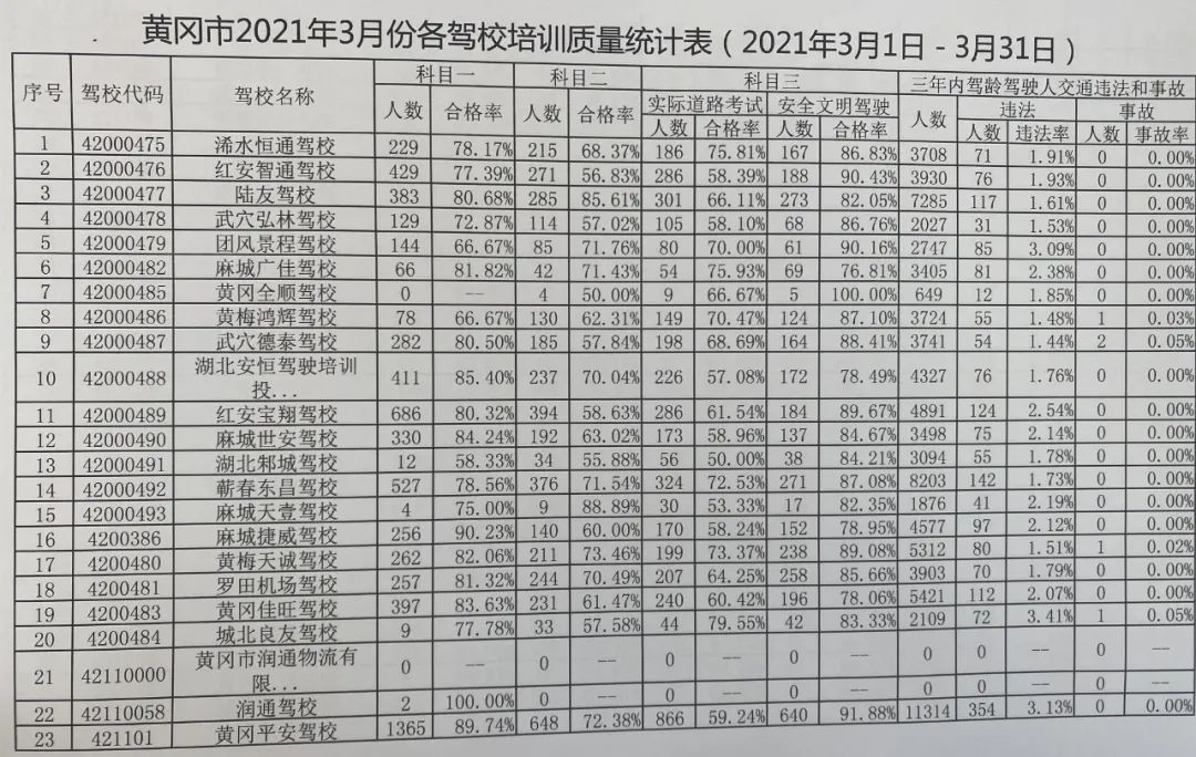 按照考試合格率,科目一前三名為潤通駕校、藍天駕校、英山駕校;科目二前三名麻城天壹駕校、怡陽駕校、陸友駕校;科目三實際道路考前三名為黃岡廣佳駕校 、城北良友駕校、黃梅紅聲駕校;科目三安全文明駕駛前三名為瑞通駕校、黃岡全順駕校、黃梅新順駕校。從三年內(nèi)駕齡駕駛人交通違法率來看,團風佳信駕校最高,達4.24%。