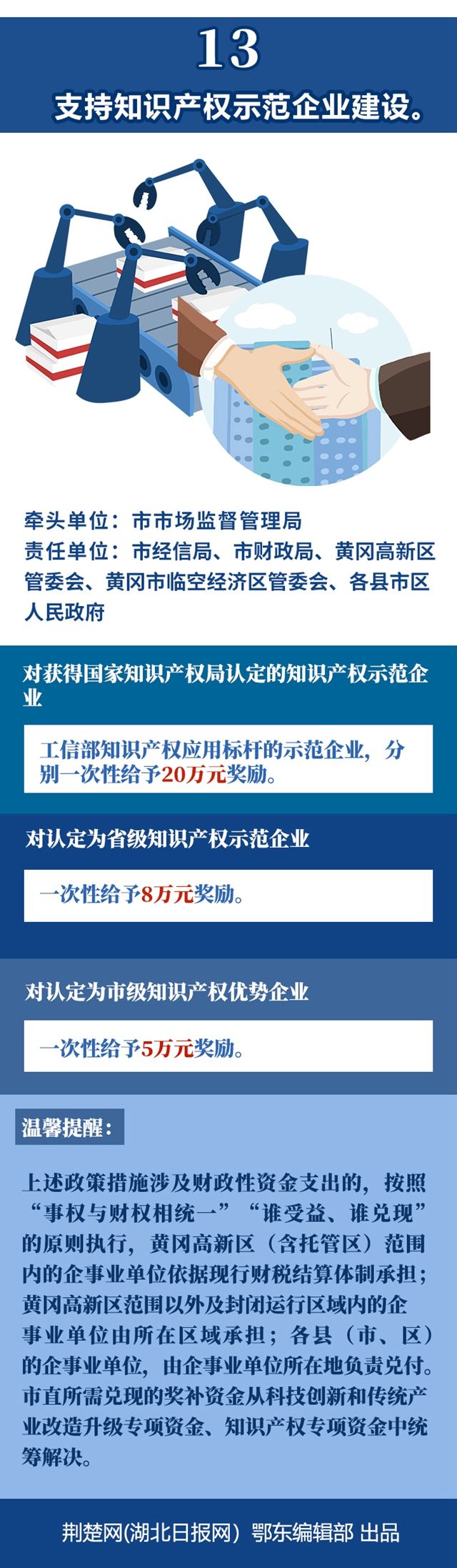 荊楚網(wǎng)(湖北日?qǐng)?bào)網(wǎng))訊(記者劉璐、王焱堯)為深入實(shí)施創(chuàng)新驅(qū)動(dòng)發(fā)展戰(zhàn)略,以科技創(chuàng)新引領(lǐng)黃岡高質(zhì)量發(fā)展,4月6日,黃岡市發(fā)布《關(guān)于支持科技創(chuàng)新若干政策》,從技術(shù)創(chuàng)新平臺(tái)建設(shè)、科技孵化平臺(tái)建設(shè)、企業(yè)申報(bào)高新技術(shù)企業(yè)等13個(gè)方面,為市場(chǎng)主體提供“真金白銀”的支持。政策的亮點(diǎn)都有哪些?荊楚網(wǎng)(湖北日?qǐng)?bào)網(wǎng))記者帶您一圖讀懂。