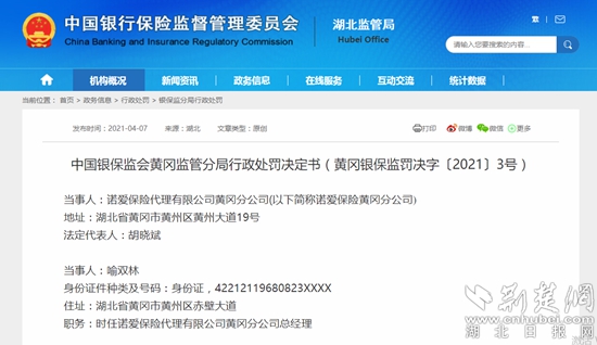 荊楚網(wǎng)(湖北日?qǐng)?bào)網(wǎng))訊(記者阮瓊)4月7日,中國(guó)銀保監(jiān)會(huì)黃岡監(jiān)管分局發(fā)布行政處罰決定書(shū),對(duì)諾愛(ài)保險(xiǎn)代理有限公司黃岡分公司(以下簡(jiǎn)稱(chēng)諾愛(ài)保險(xiǎn)代理黃岡分公司)以及該公司總經(jīng)理喻雙林分別給予警告,并罰款5000元的行政處罰決定。