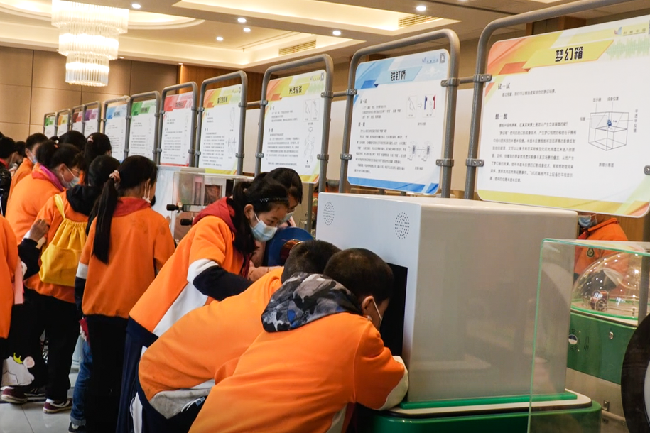 在現(xiàn)場,學(xué)生們被神奇的科學(xué)實驗吸引著,有的在"夢幻箱"和"空中成像"前駐足,有的在探尋"旋轉(zhuǎn)機(jī)械手"的奧秘,有的親身操作著"變換的風(fēng)景"、"隔空稱重"、"骨穿導(dǎo)"等展品,還有的學(xué)生們正端身正坐地觀看著科普視頻。