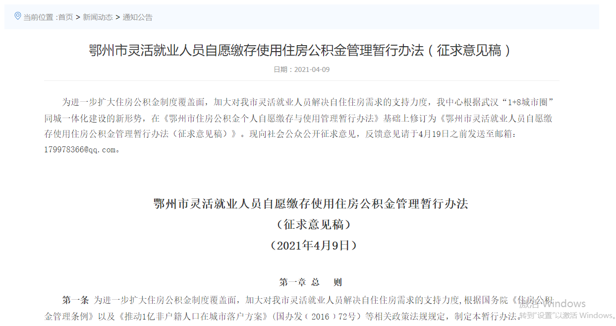 《鄂州市靈活就業(yè)人員自愿繳存使用住房公積金管理暫行辦法(征求意見稿)》。網(wǎng)頁(yè)截圖