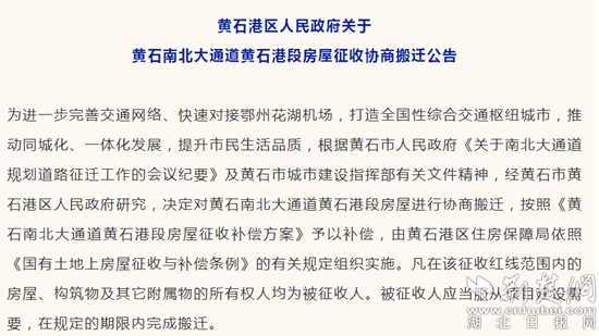 協(xié)商搬遷公告。來源:黃石發(fā)布