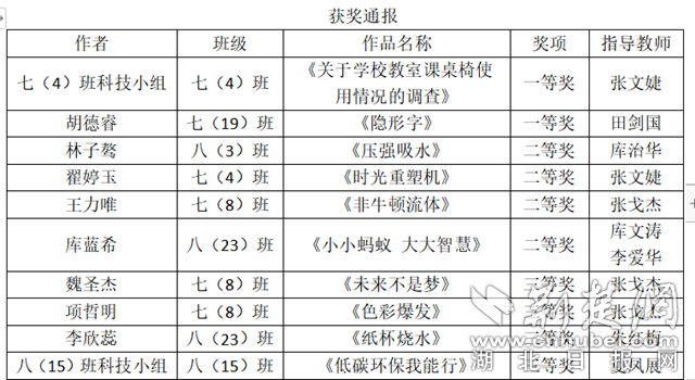 其中,七(4)班張文捷老師指導(dǎo)的作品《關(guān)于學(xué)校教室課桌椅使用情況的調(diào)查》(作者:七(4)班科技小組)、七(19)班田劍國(guó)老師指導(dǎo)的作品《隱形字》(作者:胡德睿),榮獲一等獎(jiǎng)。此外,該校獲得二等獎(jiǎng)作品4件,三等獎(jiǎng)作品4件。
