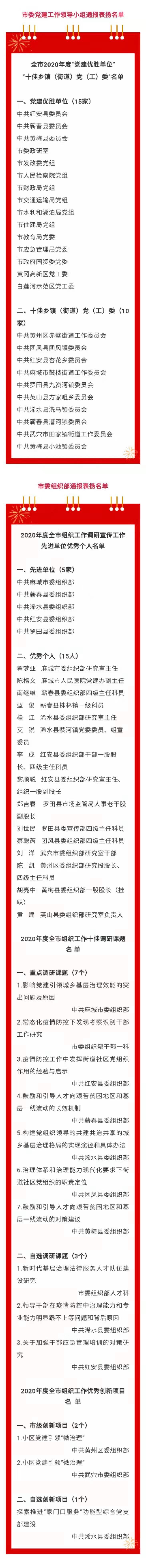 會(huì)議對(duì)2020年度“黨建優(yōu)勝單位”“十佳鄉(xiāng)鎮(zhèn)(街道)黨(工)委”“全市組織工作調(diào)研宣傳工作先進(jìn)單位和優(yōu)秀個(gè)人”“全市組織工作十佳調(diào)研課題”“全市組織工作優(yōu)秀創(chuàng)新項(xiàng)目”“全市離退休干部先進(jìn)集體和先進(jìn)個(gè)人”進(jìn)行了通報(bào)表?yè)P(yáng),并授予部分基層黨組織“全市離退休干部示范黨支部”稱號(hào)。此次有170個(gè)單位獲表彰,其中黨建優(yōu)勝單位15家。