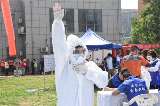 消防救援隊員進入現(xiàn)場“滅火”江岸區(qū)各街道及百步亭社區(qū)17支代表隊,參加了應(yīng)急常識答題、疫情防控“一穿三戴”、手提滅火器往返接力跑、模擬緊急救治傷員等應(yīng)急技能比武。
