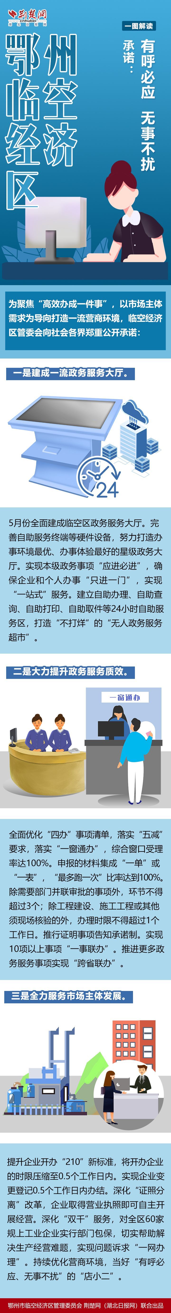 荊楚網(wǎng)(湖北日報網(wǎng))訊(記者劉璐 通訊員王濤、熊聰)5月10日,鄂州市臨空經(jīng)濟(jì)區(qū)管委會發(fā)布營商環(huán)境公開承諾書,從“建成一流政務(wù)服務(wù)大廳”“大力提升政務(wù)服務(wù)質(zhì)效”“全力服務(wù)市場主體發(fā)展”3方面進(jìn)行公開承諾,全面優(yōu)化“四辦”事項清單,落實“五減”要求,落實“一窗通辦”,綜合窗口受理率達(dá)100%。具體那些承諾?下面小編帶您“圖”個明白。