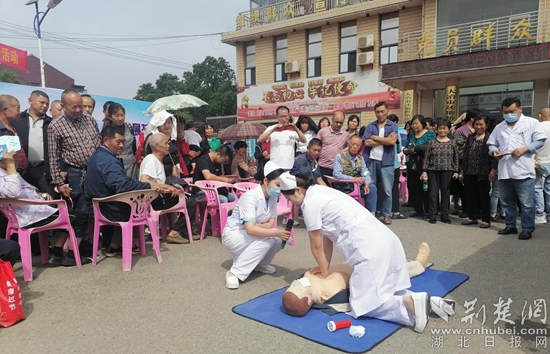 隨后,區(qū)·鎮(zhèn)衛(wèi)生院接到120急救電話,立即組織醫(yī)療急救人員趕到事發(fā)現(xiàn)場,對突發(fā)心臟病的模擬病人實(shí)施現(xiàn)場急救,衛(wèi)生院醫(yī)護(hù)人員現(xiàn)場操作了心臟復(fù)蘇雙手交疊按壓、人工呼吸等急救措施,并詳細(xì)向觀摩人員講解了操作流程。