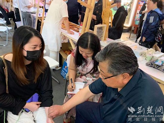 “蘄春艾灸療法”非遺傳承人韓善明現(xiàn)場(chǎng)演示瀕湖脈診技藝。(通訊員供圖)