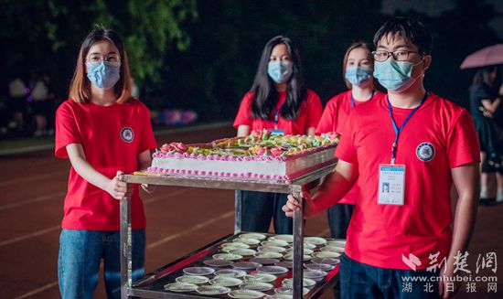 當(dāng)食品科學(xué)與工程專業(yè)學(xué)生在實(shí)驗(yàn)室自制的1.2米長、0.6米寬的方形大蛋糕徐徐推向臺(tái)前,校黨委副書記、校長陳向軍在一片歡呼聲中切開蛋糕,現(xiàn)場氣氛被推向高潮,現(xiàn)場兩千余名學(xué)生舉著手中的蛋糕,在主持人的帶動(dòng)下,齊唱《生日歌》,并高呼“祝偉大的中國共產(chǎn)黨一百歲生日快樂”。