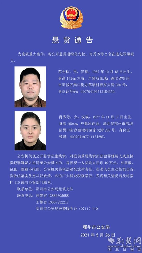 荊楚網(wǎng)(湖北日?qǐng)?bào)網(wǎng))訊(通訊員 邵峰)5月26日,鄂州市公安局發(fā)布懸賞公告,公開懸賞通緝范先松、肖秀芳等2名在逃犯罪嫌疑人,懸賞金額共計(jì)20萬(wàn)元。