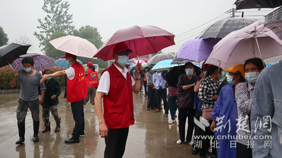 5月26日,細(xì)雨綿綿,黃石臨空經(jīng)濟(jì)區(qū)·還地橋鎮(zhèn)方艙接種點(diǎn),現(xiàn)場(chǎng)一片忙碌。然而,因?yàn)橛?0余名志愿者們冒雨來(lái)回穿梭,現(xiàn)場(chǎng)秩序井然?!安恢?,慢慢下車,我來(lái)幫您撐傘?!薄按竽铮晏罅?,小心濕滑?!薄跋群缺瓱崴?,有沒(méi)有哪不舒服啊?”......一幕墓溫馨的場(chǎng)面讓人心頭一暖。