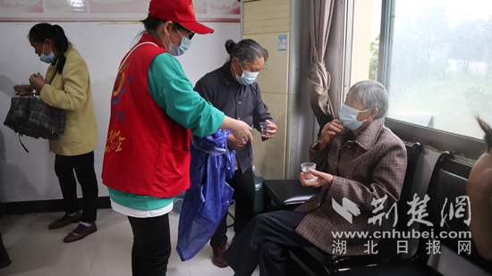 志愿者為需要幫助的老人遞上熱水。通訊員 供圖