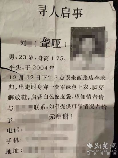 2004年12月12日,一個(gè)普通的日期,但對(duì)劉某的家人來說,這個(gè)日子卻讓他們終生難忘。從小在農(nóng)村長大的聾啞小伙劉某,在乘坐客車回老家福田河的途中因搭錯(cuò)車,去往了麻城西張店(現(xiàn)屬順河鎮(zhèn)),后與家人失聯(lián)。17年來,父母和家人每年都通過各種方法尋人,張貼尋人啟事、電視臺(tái)、媒體尋找……但一直沒有消息,帶他出門的奶奶萬分自責(zé),甚至多次產(chǎn)生輕生的念頭,他的父親更是滿頭白發(fā),令人心疼。