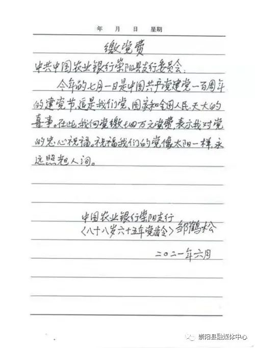 廖海峰告訴記者,來(lái)之前,鄒鶴松老人特意向中國(guó)農(nóng)業(yè)銀行崇陽(yáng)支行黨委寫(xiě)了一封信,信里這樣寫(xiě)著:“今年是中國(guó)共產(chǎn)黨建黨100周年,這是我們黨、國(guó)家和全國(guó)人民天大的喜事。在此,我向黨繳納4萬(wàn)元黨費(fèi),表示我對(duì)黨的衷心祝福。祝福我們的黨像太陽(yáng)一樣,永遠(yuǎn)照耀人間?!币痪渚浜?jiǎn)單樸實(shí)的語(yǔ)言,彰顯著一名老黨員赤心向黨、一心為黨樸實(shí)而偉大的情懷。