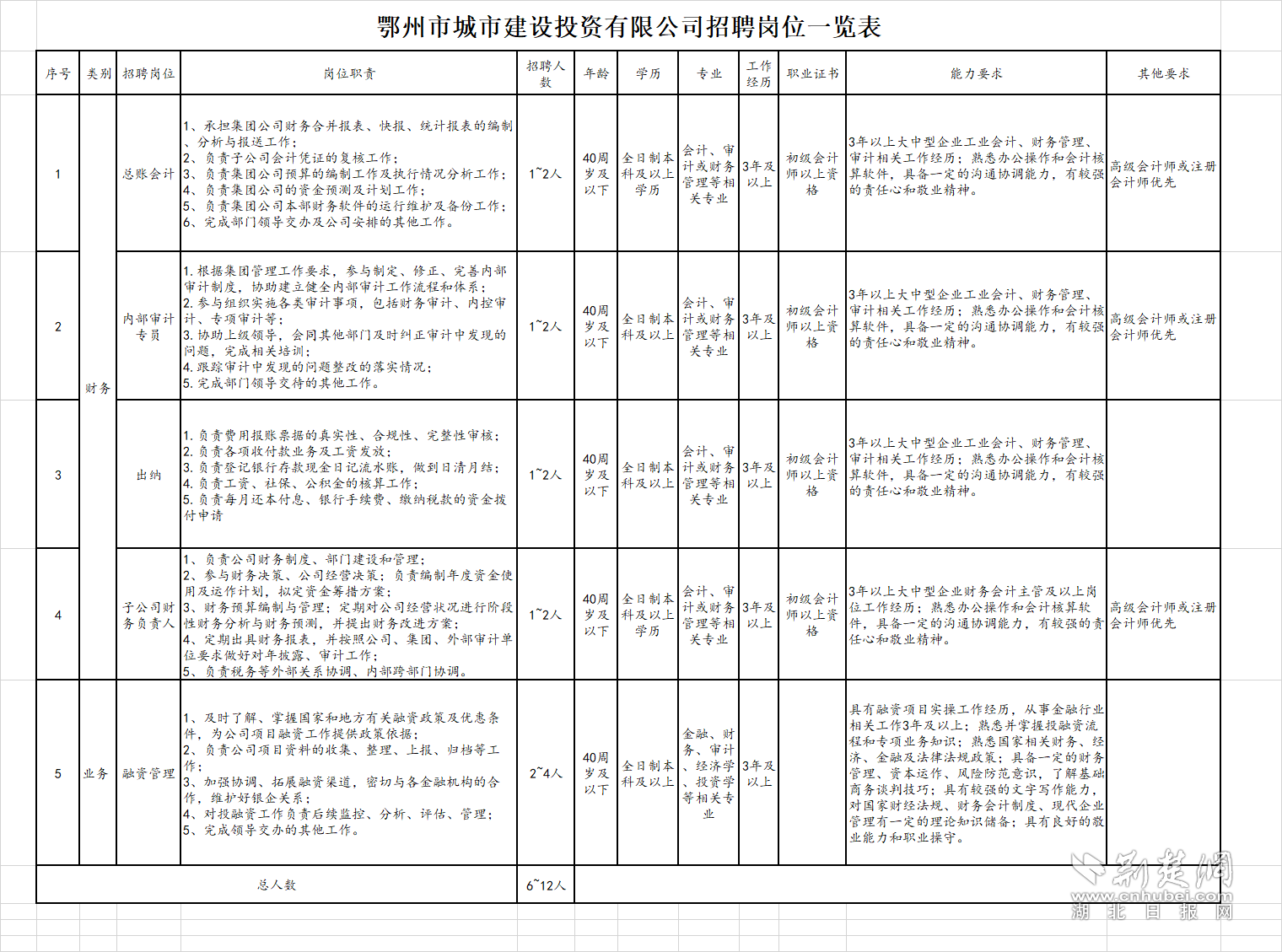 荊楚網(wǎng)(湖北日?qǐng)?bào)網(wǎng))訊(記者劉璐 通訊員饒夢(mèng)池)6月8日,記者從鄂州市城市建設(shè)投資有限公司獲悉,該公司面向社會(huì)公開招聘6~12名財(cái)務(wù)人員,招聘人員年齡上限擴(kuò)大至40歲。