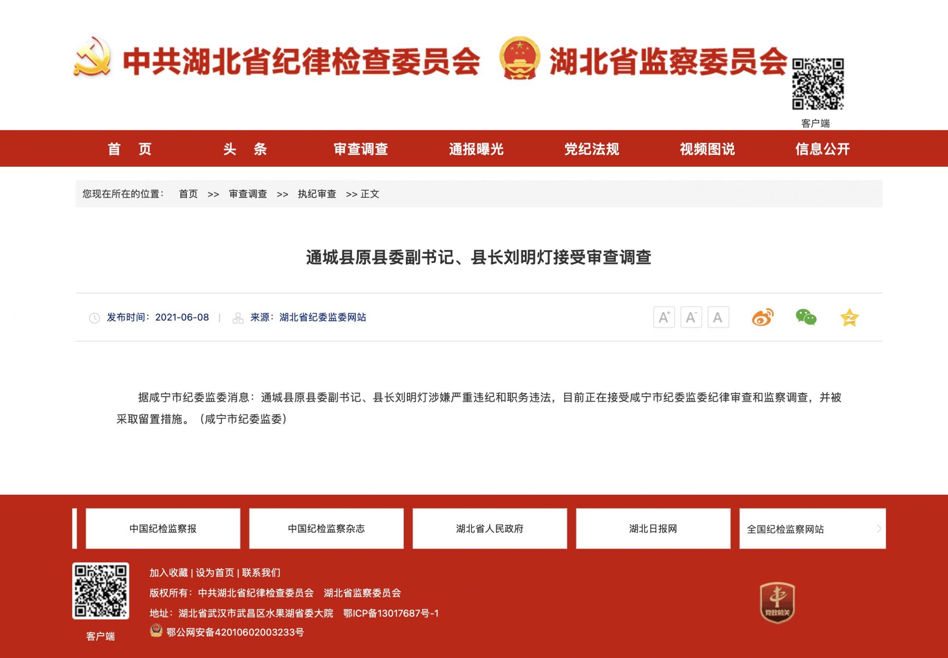 據(jù)咸寧市紀(jì)委監(jiān)委消息:通城縣原縣委副書記、縣長劉明燈涉嫌嚴(yán)重違紀(jì)和職務(wù)違法,目前正在接受咸寧市紀(jì)委監(jiān)委紀(jì)律審查和監(jiān)察調(diào)查,并被采取留置措施。