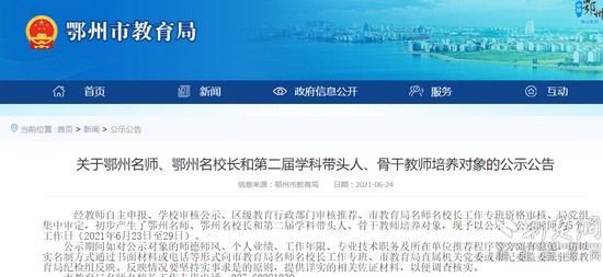 據(jù)悉,此次申報(bào)經(jīng)教師自主申報(bào)、學(xué)校審核公示、區(qū)級(jí)教育行政部門(mén)審核推薦、市教育局名師名校長(zhǎng)工作專班資格審核、局黨組集中審定,初步產(chǎn)生了鄂州名師、鄂州名校長(zhǎng)和第二屆學(xué)科帶頭人、骨干教師培養(yǎng)對(duì)象,予以公示的時(shí)間為5個(gè)工作日(2021年6月23日至29日)。
