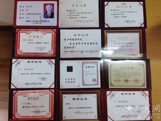 “鄂州市道德模范”、“鄂州市優(yōu)秀志愿者”“荊楚楷?!薄皟?yōu)秀共產(chǎn)黨員”……一張張證書無聲述說著祝光賢往昔十余年為鄂州所做的點(diǎn)點(diǎn)滴滴。