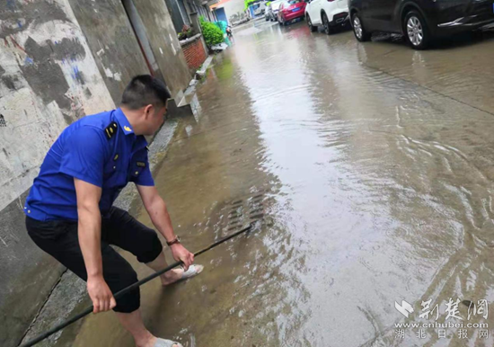 黃梅縣城管執(zhí)法局冒雨進行排澇清障工作。通訊員 供圖