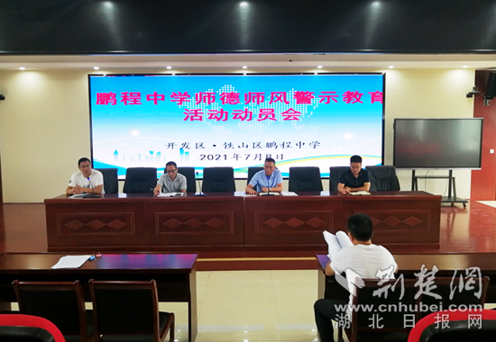 7月9日上午,黃石開發(fā)區(qū)·鐵山區(qū)鵬程中學在報告廳召開了師德師風警示教育活動動員會。會上傳達了上級部門有關文件精神,學習了典型案例,全體教師簽訂《鵬程中學師德師風承諾書》。會議由黨支部書記、校長柏建敏主持,全體教師參加了會議。