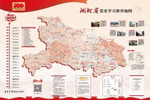 《湖北省黨史學(xué)習(xí)教育地圖》以湖北省普通地圖為底板,嵌入人物、事件和紅色資源等要素,圖文并茂,直觀呈現(xiàn)重要黨史事件和重要紅色遺跡,包含有教育地圖、建黨百年湖北大事記、省直機(jī)關(guān)黨員干部教育基地名單、習(xí)近平總書記與湖北故事、湖北籍開國將帥名錄、黨史故事二維碼等模塊內(nèi)容。其中教育地圖重點(diǎn)標(biāo)繪了省內(nèi)烈士陵園、紀(jì)念碑、革命根據(jù)地紀(jì)念館、舊址、名人故居等重要學(xué)習(xí)教育基地,全方位、多角度地展現(xiàn)了湖北這片熱土上發(fā)生的重要?dú)v史事件。