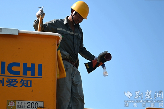 半空中,王定操作著車斗在導(dǎo)線間穿梭,在作業(yè)面導(dǎo)線兩端安裝上紅色的絕緣遮蔽罩,用電動扳手?jǐn)Q開螺絲,解開引流線,全然不顧汗水浸濕了工作服。