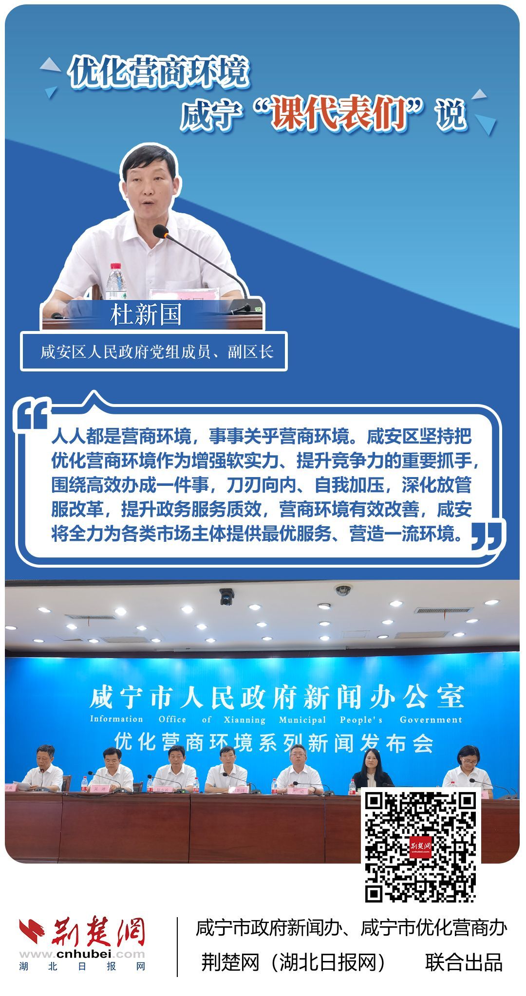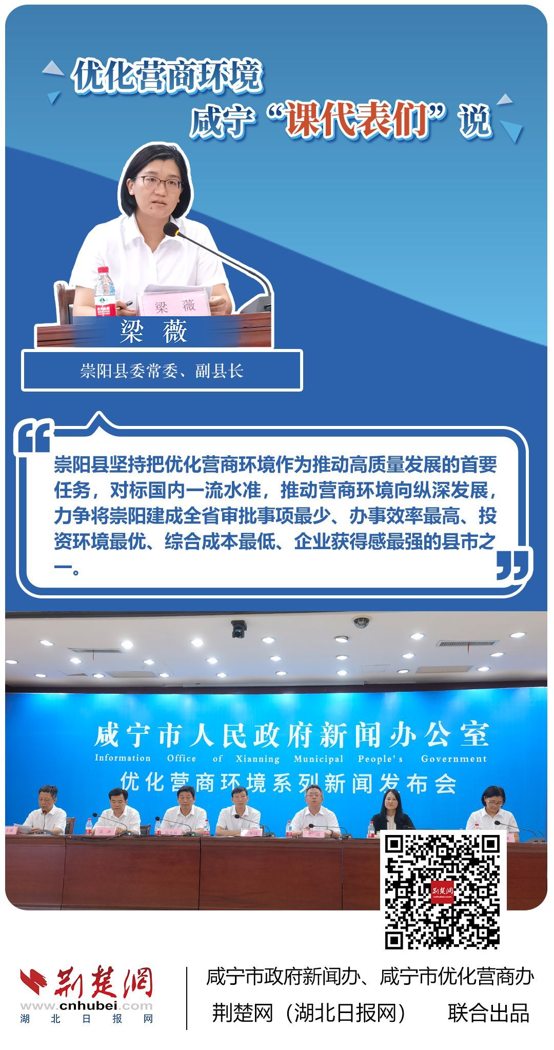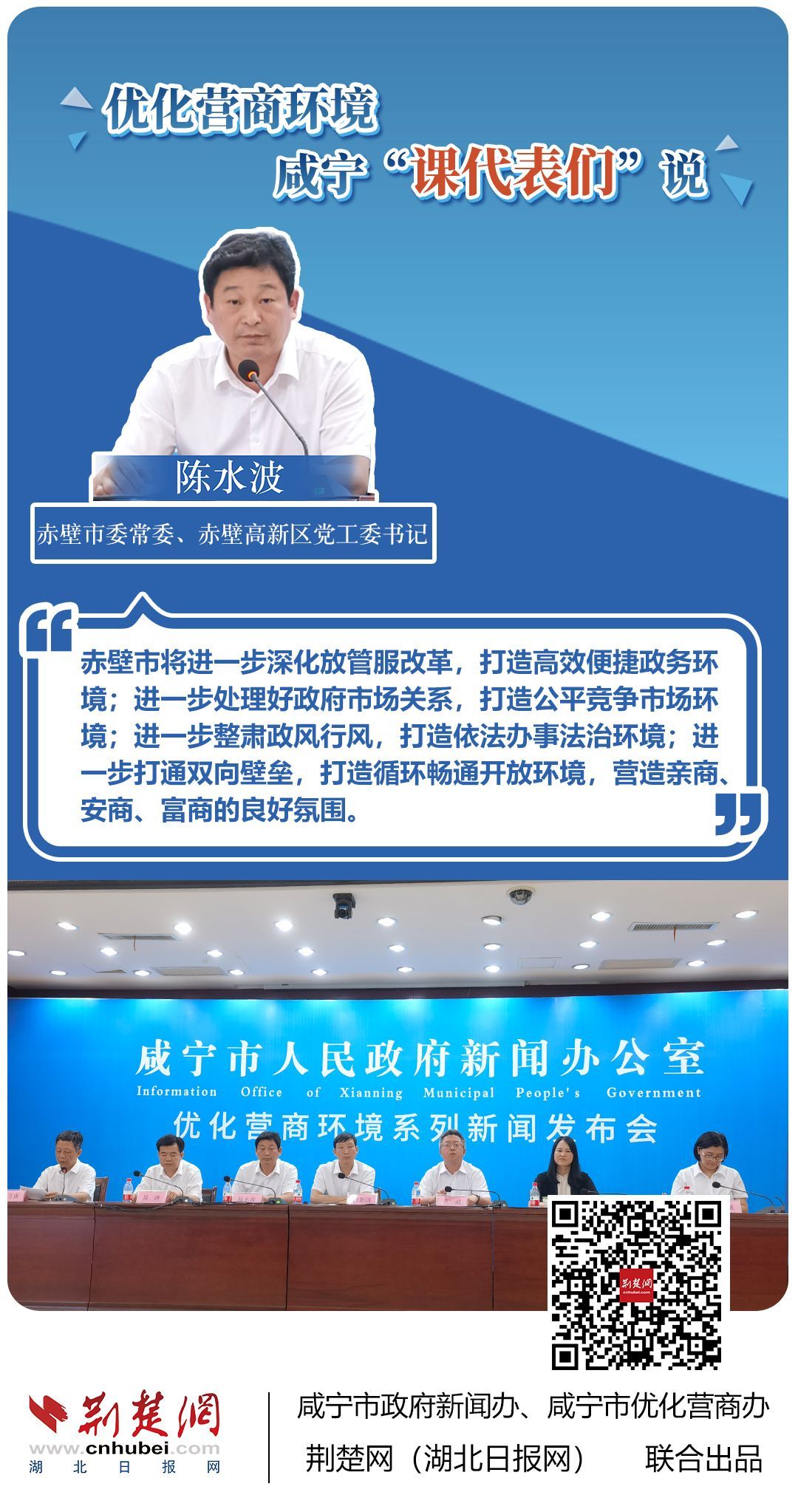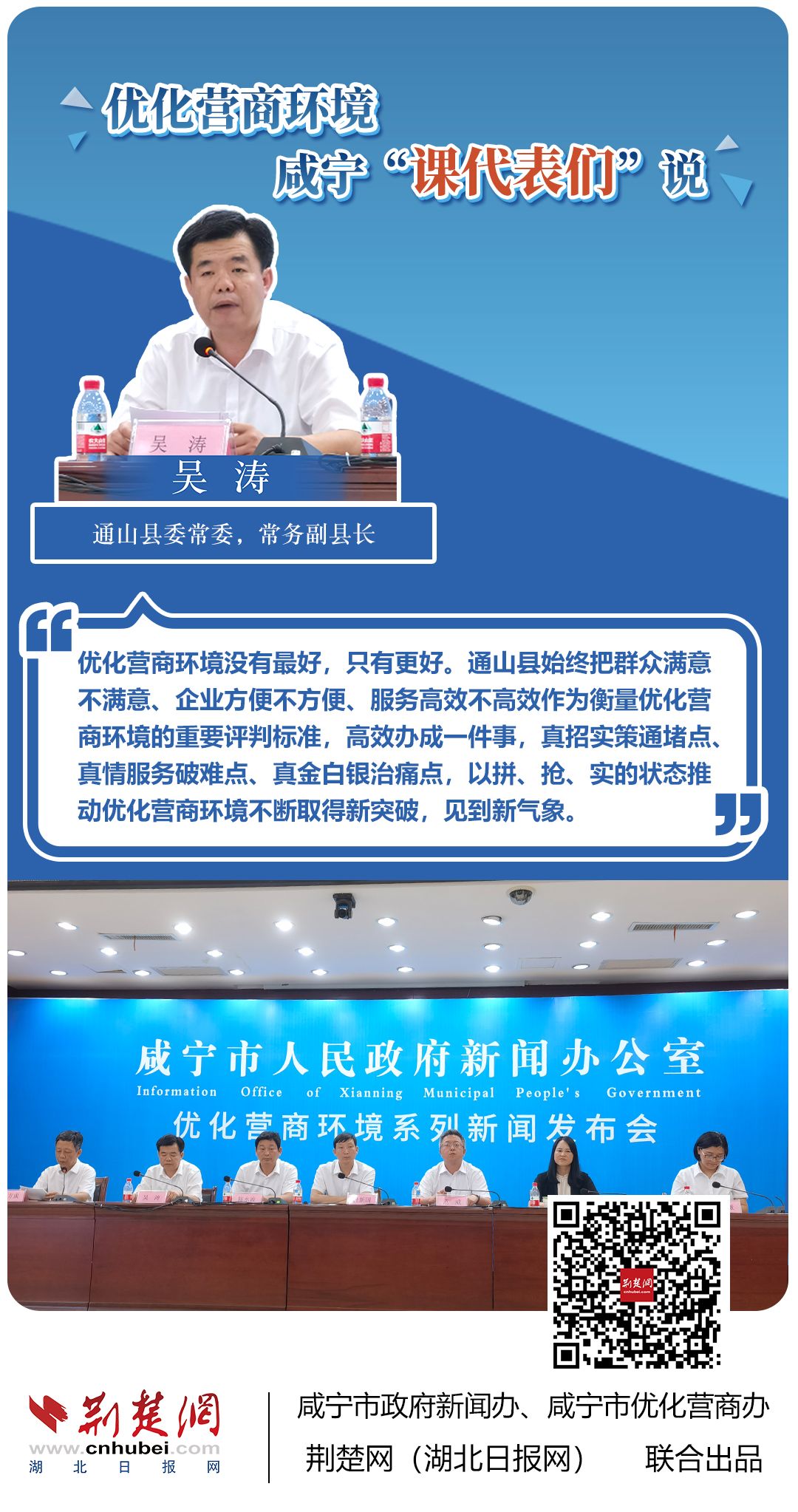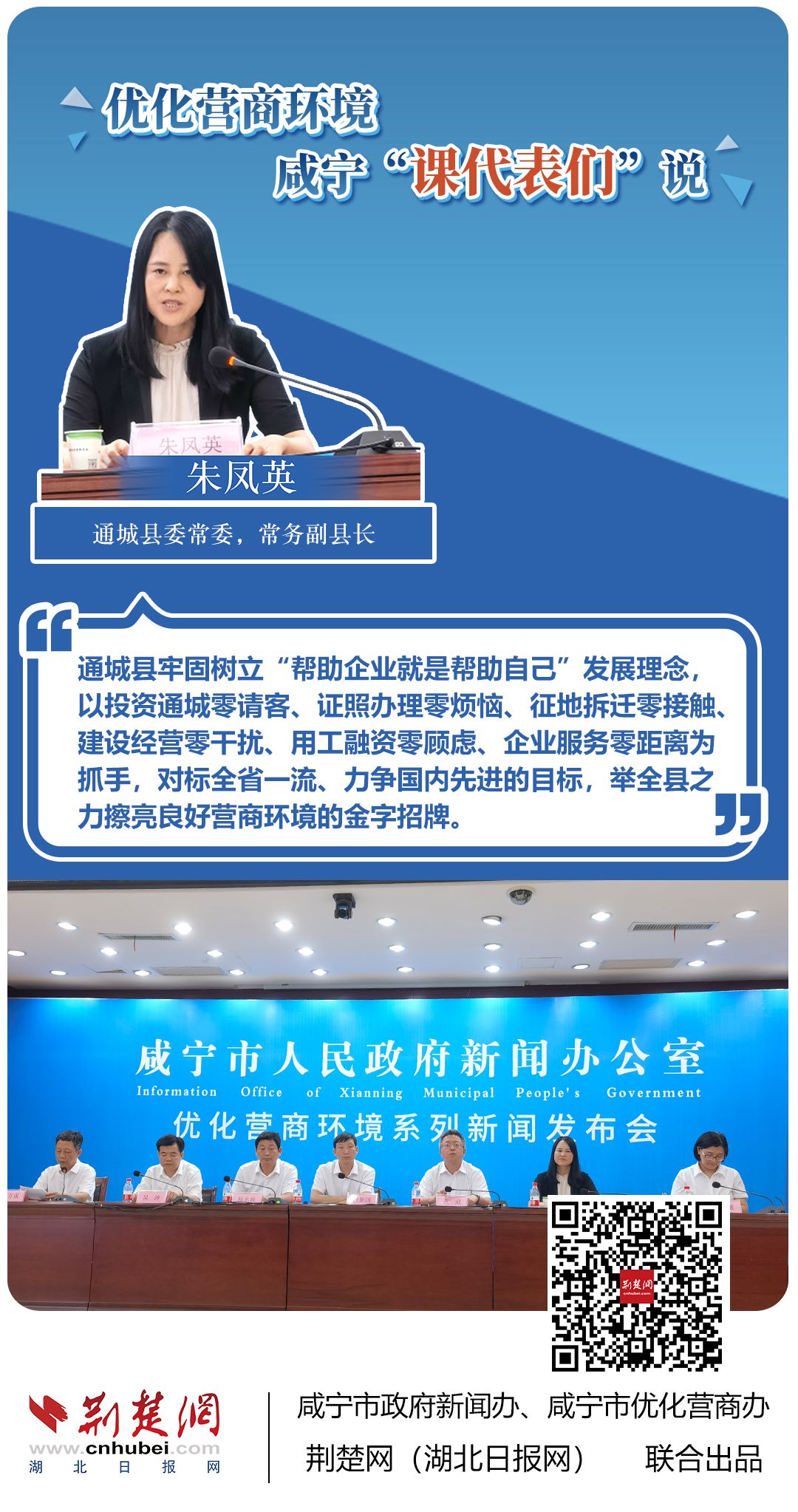 荊楚網(wǎng)(湖北日報網(wǎng))訊(記者 田城 通訊員 孫方成 張永紅)跨省通辦、“零干擾環(huán)境”、最簡流程優(yōu)服務(wù)、深化“放管服”改革、整肅行風(fēng)政風(fēng)……7月20日下午,咸寧市召開優(yōu)化營商環(huán)境新聞發(fā)布會。會上,咸安區(qū)、嘉魚縣、赤壁市、通城縣、崇陽縣、通山縣6個縣市區(qū)優(yōu)化營商環(huán)境發(fā)言人亮相,全面介紹當(dāng)?shù)貎?yōu)化營商環(huán)境有關(guān)情況,持續(xù)推進咸寧市營商環(huán)境朝著更優(yōu)、更好方向前進。
