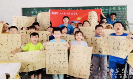 志愿者帶領留守兒童學書法。通訊員供圖