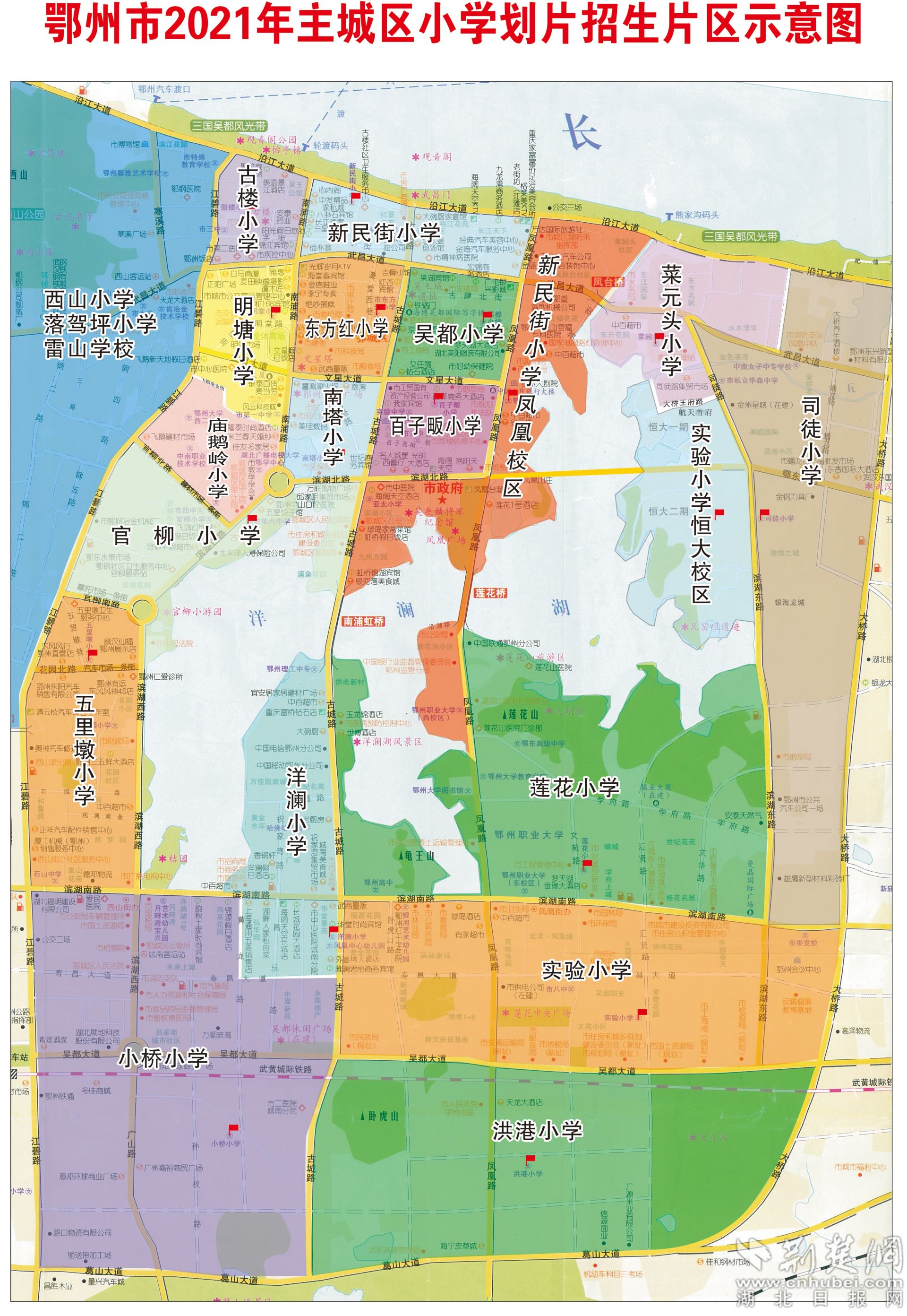 圖為鄂州市2021年主城區(qū)小學(xué)劃片招生片區(qū)示意圖。(鄂州市教育局官網(wǎng) 提供)