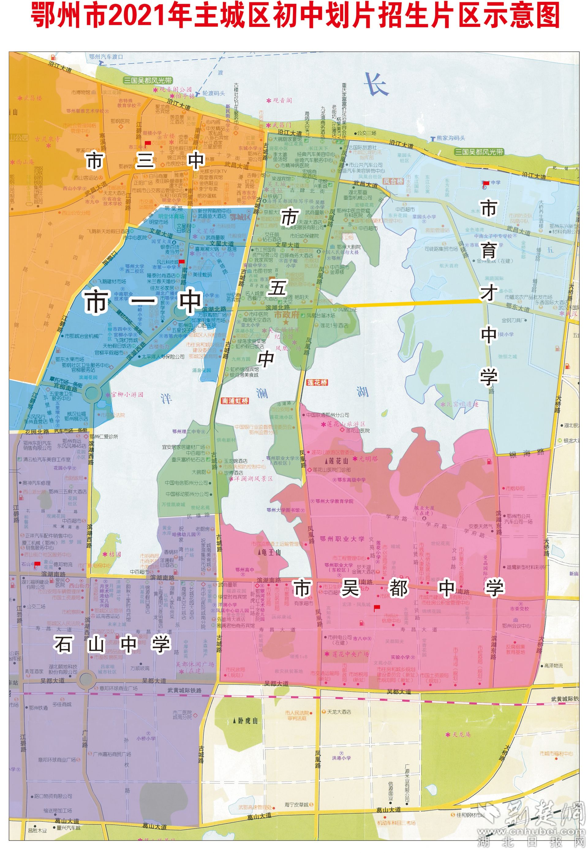 圖為鄂州市2021年主城區(qū)初中劃片招生片區(qū)示意圖。(鄂州市教育局官網(wǎng) 提供)