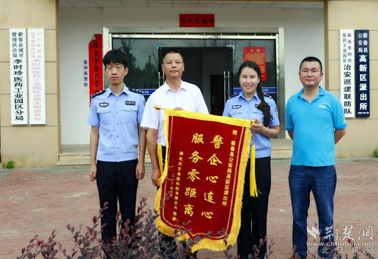 湖北沃爾萊博科技有限公司總經(jīng)理董正新給蘄春縣公安局高新區(qū)派出所送錦旗。通訊員 供圖