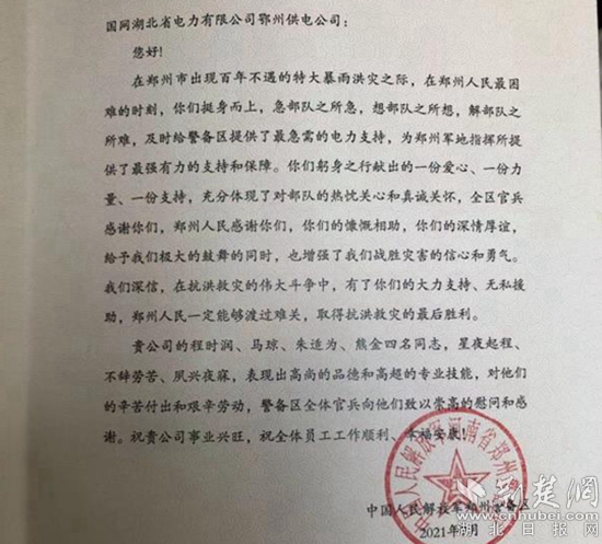 從7月22日清晨出發(fā),到28日?qǐng)A滿完成保電任務(wù),四名援豫的鄂州保電人員在鄭州堅(jiān)守崗位7天7夜,保障了該指揮中心的正常電力供應(yīng)。7月29日一大早,保電人員收到一封感謝信;下午,又收到警備區(qū)送來的錦旗和感謝信。