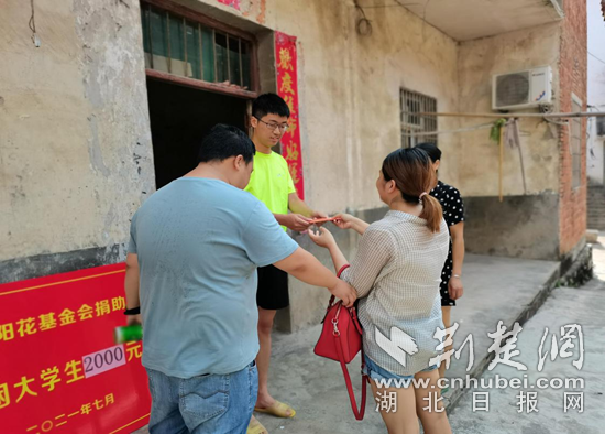 荊楚網(wǎng)(湖北日?qǐng)?bào)網(wǎng))訊(通訊員 柯文華)7月31日上午,向陽花基金會(huì)兩位理事長馮南山、程慧來到金盆村高中畢業(yè)生陳杰家里,將基金會(huì)的贊助資金2000元現(xiàn)金交到陳杰手中,靦腆的陳杰臉上露出了舒心的笑容。