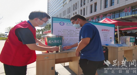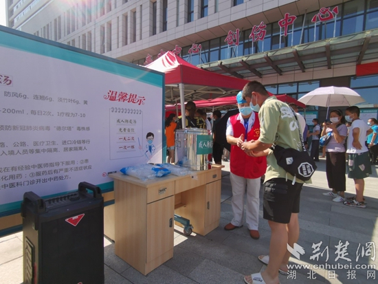 8月6日,麻城市人民醫(yī)院志愿者在醫(yī)院核酸采集點免費為前來進行核酸采集的人群發(fā)放成人防疫湯。通訊員 供圖