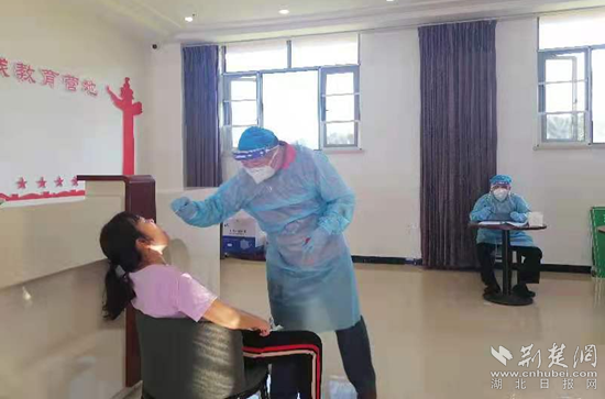 為盡快完成紅安轄區(qū)全民核酸檢測工作,在接到入戶檢測通知后,該市疾控中心采樣組工作人員不畏酷暑,在集中隔離點為隔離人員做核酸檢測。