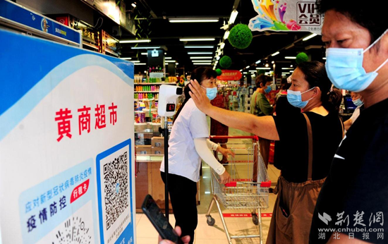 在城區(qū)黃商超市入口,消費(fèi)者自覺(jué)戴口罩、測(cè)溫,并主動(dòng)掃碼通行。通訊員 供圖