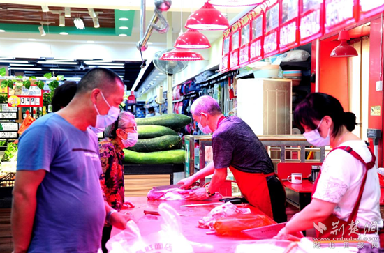 各大商超貨源充足,供應(yīng)平穩(wěn),圖為市民佩戴口罩有序采購(gòu)生活物資。通訊員 供圖