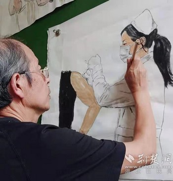 據(jù)了解,王家振自市總工會財務(wù)部退休后,兼任了武漢關(guān)山書畫院理事、武穴市書協(xié)和美協(xié)副主席,自疫情發(fā)生后,他在家作畫,用他的畫筆關(guān)注時事,贊美抗疫英雄?!氨姸鄨允卣呷諔?zhàn)酷暑、腳踏星辰,奮戰(zhàn)疫情第一線,激發(fā)了我的創(chuàng)作靈感。”