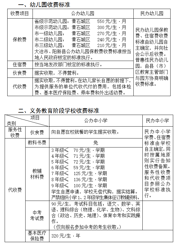 黃石市2021年秋季中小學(幼兒園)收費標準。來源:黃石市教育局官網