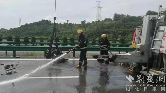 事故發(fā)生正值中午,高速路氣溫超過(guò)33攝氏度,事故現(xiàn)場(chǎng)的汽油味十分濃烈,處置過(guò)程中一旦因摩擦產(chǎn)生火花,就可能引燃泄漏的汽油,造成二次災(zāi)害事故。