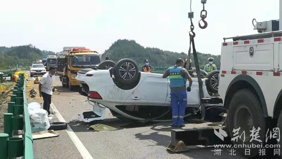 13時(shí)16分,消防救援人員第一時(shí)間趕到現(xiàn)場(chǎng)。經(jīng)偵查發(fā)現(xiàn),一輛白色小轎車因不慎撞到高速護(hù)欄旁的防撞沙桶而發(fā)生側(cè)翻,“四輪朝天”橫臥在高速公路上,事故路段一片狼藉,車輛的部分零部件散落到30米外,轎車的發(fā)動(dòng)機(jī)已經(jīng)脫落。
