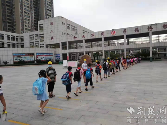 荊楚網(wǎng)(湖北日報網(wǎng))訊 (通訊員毛紅平)9月1日早上8點(diǎn)左右,在紅安縣永佳河鎮(zhèn)小學(xué)大門口,孩子們佩戴口罩,陸續(xù)來到學(xué)校,大家按照間隔一米的距離要求排隊(duì),經(jīng)過體溫測量后有序進(jìn)入校園。