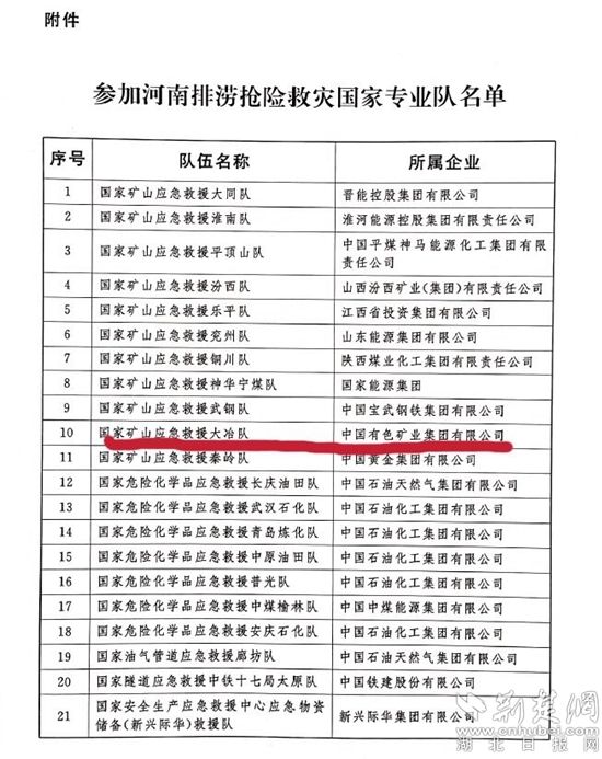 參加河南排澇搶險救災(zāi)的國家專業(yè)隊名單。通訊員供圖