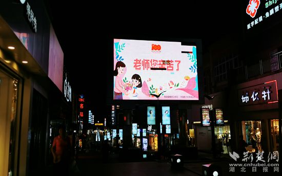 荊楚網(wǎng)(湖北日報網(wǎng))訊(通訊員 徐寬 王斌)9月9日晚,黃岡市城區(qū)黃商購物中心戶外顯示屏上亮起了醒目的“老師,您好!”“賡續(xù)百年初心,擔(dān)當(dāng)育人使命”等字幕,引得來往行人駐足觀賞。