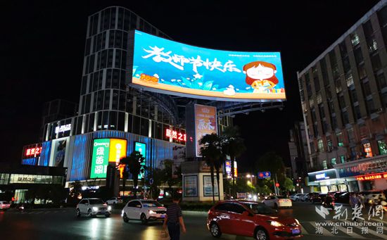 當(dāng)晚,在黃岡城區(qū)鑫湖大廈、萬達(dá)廣場、黃州大道黃商購物中心、勝利街奧康步行街、遺愛湖臨皋春曉、新荊楚大酒店、市人大政協(xié)辦公樓等室外屏幕及出租車車頂顯示屏上,以字幕滾動等多種方式亮出“老師,您好”“教師節(jié)快樂”等口號、標(biāo)語,向全市教師致敬。