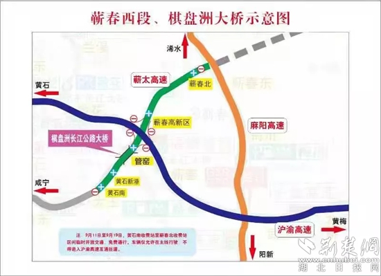 蘄春至太湖高速公路蘄春西段臨時免費通行路段不與麻陽至武穴高速公路樞紐互通(株林樞紐互通)連通;棋盤洲長江公路大橋應急通行路段不與棋盤洲長江公路大橋連接線陽新至大冶段連通,不與黃黃高速公路樞紐互通(紅旗崗樞紐互通)連通。