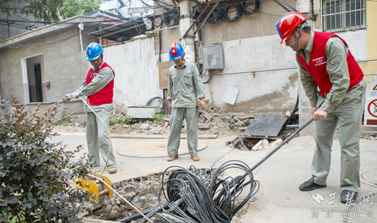 麻城市供電公司工作人員在老城區(qū)對(duì)宋家灣老舊電力線路進(jìn)行改造。通訊員 供圖