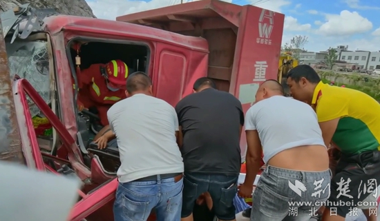12時(shí)19分,消防救援人員第一時(shí)間趕到現(xiàn)場(chǎng)經(jīng)勘查發(fā)現(xiàn):一輛滿載石頭的貨車下山與一輛半掛車上山,為搶道兩車迎面相撞,貨車車頭卡在半掛車與路墻中間,車頭嚴(yán)重變形,司機(jī)左腳受傷被卡在駕駛室方向盤下方,無法動(dòng)彈。
