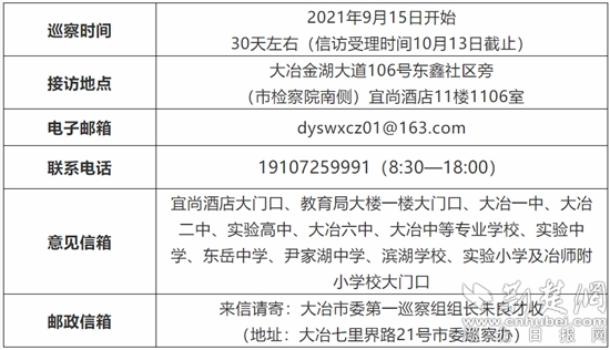 大冶市委第一巡察組在市教育局巡察“回頭看”期間的具體聯(lián)系方式。來源:大冶發(fā)布