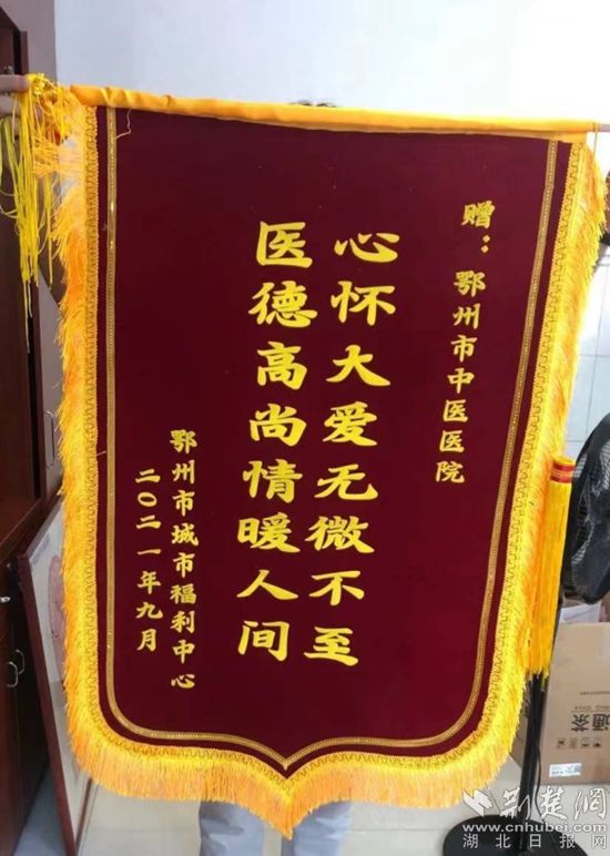 荊楚網(wǎng)(湖北日?qǐng)?bào)網(wǎng))訊(通訊員 嚴(yán)炎)9月18日上午,鄂州市城市福利中心為鄂州市中醫(yī)醫(yī)院送來(lái)了一面寫(xiě)著“心懷大愛(ài)無(wú)微不至,醫(yī)德高尚情暖人間”的錦旗,向鄂州市中醫(yī)醫(yī)院駐守城市福利中心的醫(yī)務(wù)人員表示感謝。